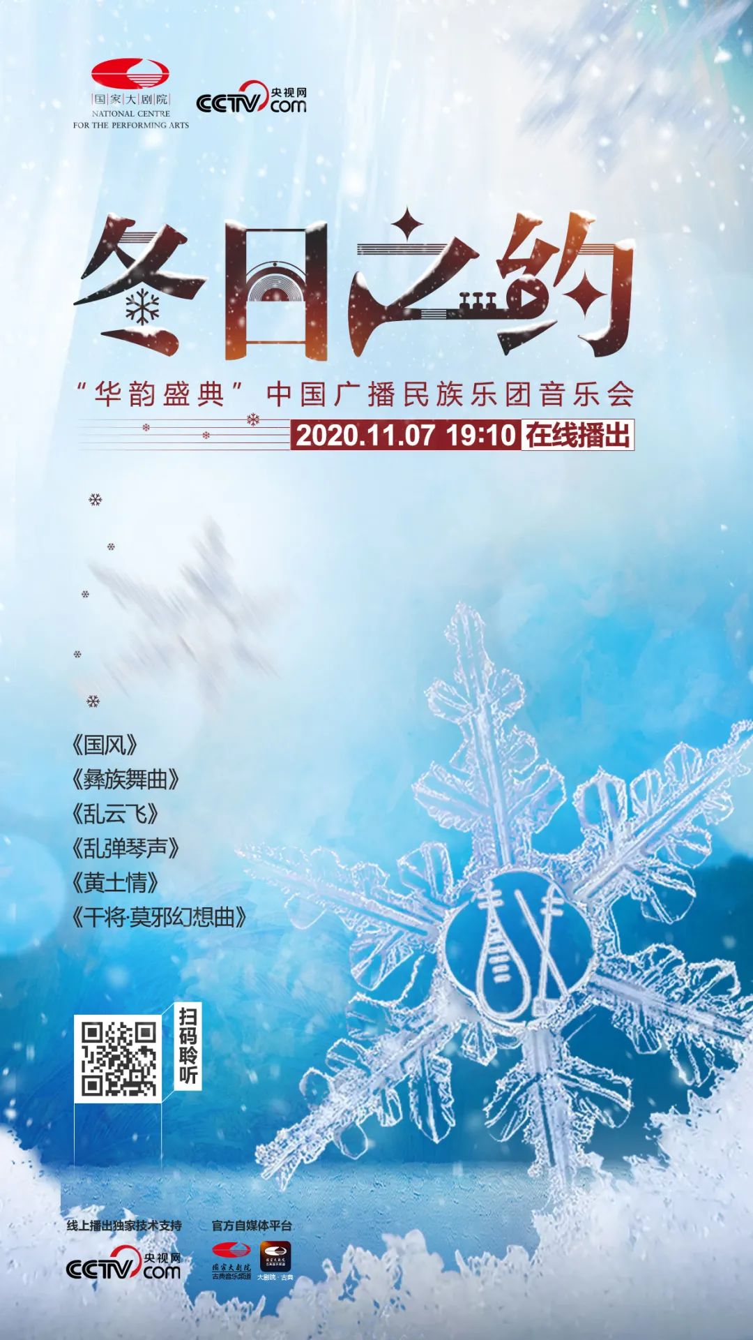 2020年11月7日晚,国家大剧院“冬日之约”的首场演出“华韵盛典”中国广播民族乐团音乐会在云端与各位观众见面。